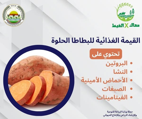 وأوضحت الوزارة أن البطاطا الحلوة غنية بالبروتين والنشا، إلى جانب احتوائها على الأحماض الأمينية والفيتامينات الضرورية للجسم، بالإضافة إلى مجموعة من الصبغات الطبيعية المفيدة.