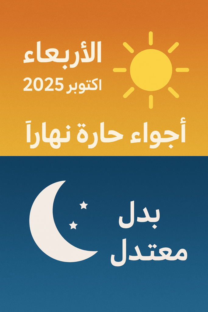 تتوقع الهيئة العامة للأرصاد الجوية أن يسود اليوم الأربعاء 1 أكتوبر 2025 طقس حار على أغلب الأنحاء، شديد الحرارة على جنوب الصعيد، بينما يكون معتدل الحرارة ليلًا على كافة المناطق.