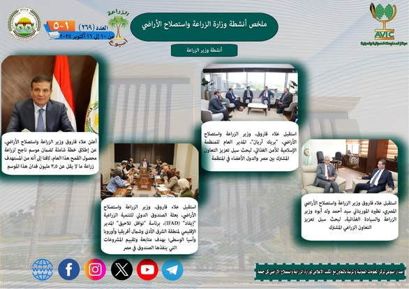 وخلال هذا الأسبوع استقبل علاء فاروق وزير الزراعة واستصلاح الأراضي المصري، نظيره الموريتاني سيد أحمد ولد أبوه وزير الزراعة والسيادة الغذائية، لبحث سبل تعزيز التعاون الزراعي المشترك، كما استقبل فاروق، “بريك آريان”، المدير العام للمنظمة الإسلامية للأمن الغذائي، لبحث سبل تعزيز التعاون المشترك بين مصر والدول الأعضاء في المنظمة، كذلك استقبل أيضا بعثة الصندوق الدولي للتنمية الزراعية “إيفاد” (IFAD)، بهدف متابعة وتقييم المشروعات التي ينفذها الصندوق في مصر.