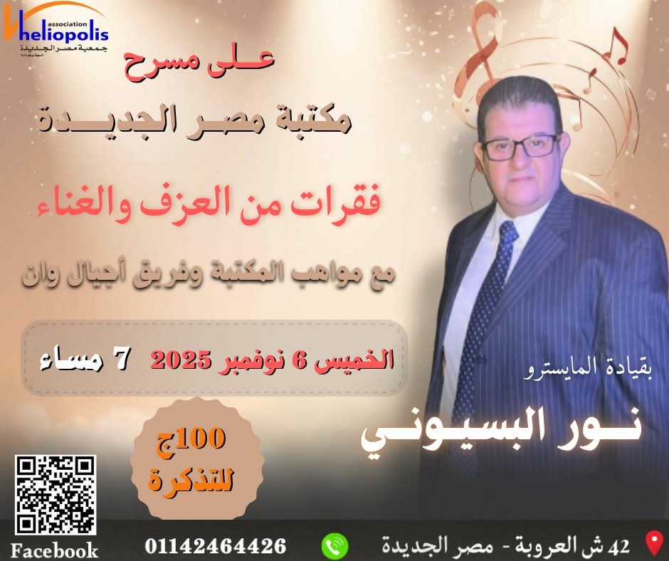 تنظم مكتبة مصر الجديدة العامة فى الساعة السابعة من مساء بعد غد الخميس ، حفل موسيقى لمواهب المكتبة نتاج ورش لتعليم كافة أنواع الآلات الموسيقية وعزف كورال وطبلة وغناء بقيادة الفنان نور البسيوني .