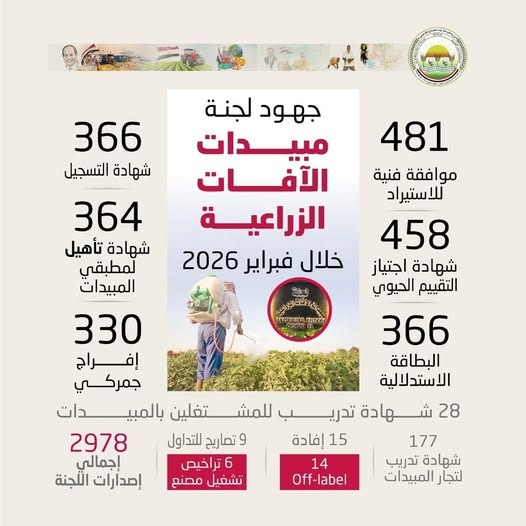 أعلنت وزارة الزراعة واستصلاح الأراضي، عن إجمالي ما أصدرته، لجنة مبيدات الآفات الزراعية، من خدمات وإجراءات فنية وتنظيمية خلال شهر فبراير الماضي، تنفيذا لتوجيهات السيد علاء فاروق وزير الزراعة واستصلاح الأراضي، بتكثيف جهود تنظيم تداول واستخدام المبيدات وضمان تطبيق المعايير الفنية والرقابية للحفاظ على الإنتاج الزراعي وصحة الإنسان والبيئة.