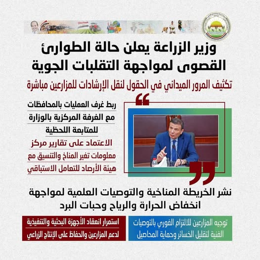 وأكد الوزير على المرور الميداني المكثف والتواجد في الحقول لنقل التوصيات للمزارعين مباشرة، وربط غرف العمليات بمديريات الزراعة بالغرفة المركزية لمتابعة تنفيذ الإرشادات الفنية لحظة بلحظة، مع نشر الخريطة المناخية والتوصيات العلمية لمواجهة انخفاض درجات الحرارة ونشاط الرياح وحبات البرد.