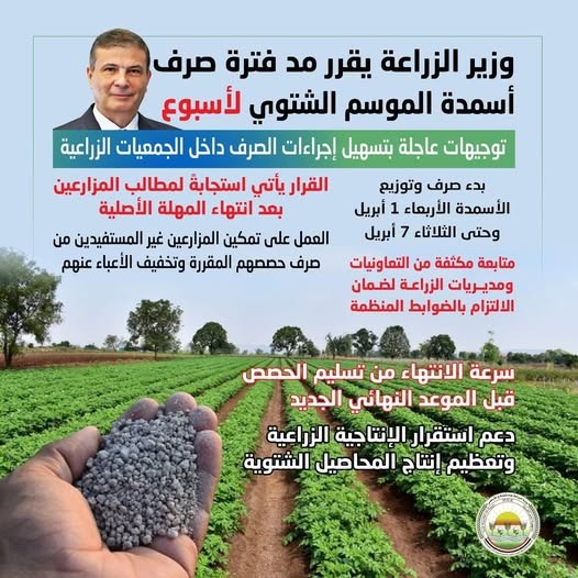 عاجل| وزير الزراعة يقرر مد فترة صرف أسمدة الموسم الشتوي لمدة أسبوع ينتهي في 7 ابريل المقبل